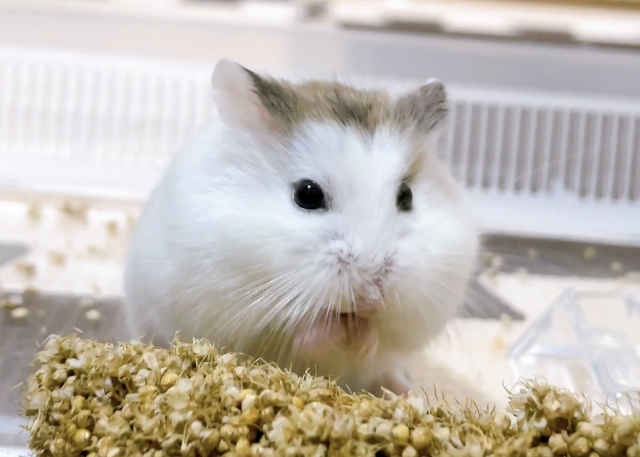 懐きにくいロボロフスキーハムスターですが、手からおやつを受け取ってくれる子も意外と多く、まずは夕方以降の時間帯に1〜2粒ほど与えてみましょう。